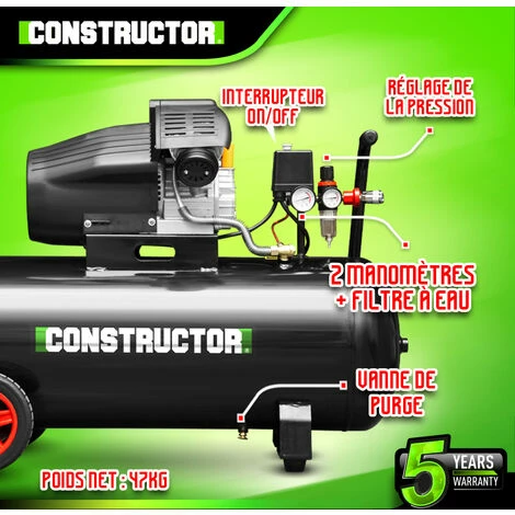 Avec sa cuve de 100L équipée d’une vanne de purge et son débit d’air de 250L/min, le compresseur CTAC8-100 de la marque Constructor vous permettra de gonfler, d’agrafer, de buriner, de souffler, d’utiliser un pistolet peinture…