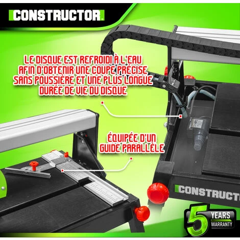 Cette table coupe carrelage radiale électrique 800 W de la marque Constructor est idéale pour la coupe rapide et précise de pierres et de carreaux muraux et de sol en céramique. Elle possède un disque diamant de 200 mm de diamètre et peut couper jusqu’à 35 mm de profondeur (90°). Le disque est refroidi à l’eau afin d’obtenir une coupe précise sans poussière et une plus longue durée de vie du disque.
